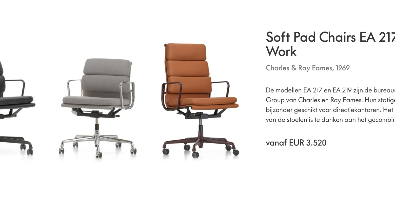 Design klassieker model Eames model EA217 ( lage rug ) & EA219 ( hoge rug ). De stoel is enkel verkrijgbaar in leder of premium leder. De zijprofielen, dwarsprofielen, armleggers en het onderstel zijn verkrijgbaar in gepolijst of verchroomd spuitgietaluminium. Leverbaar met harde wielen voor tapijt of zachte wielen voor vloer en parket.